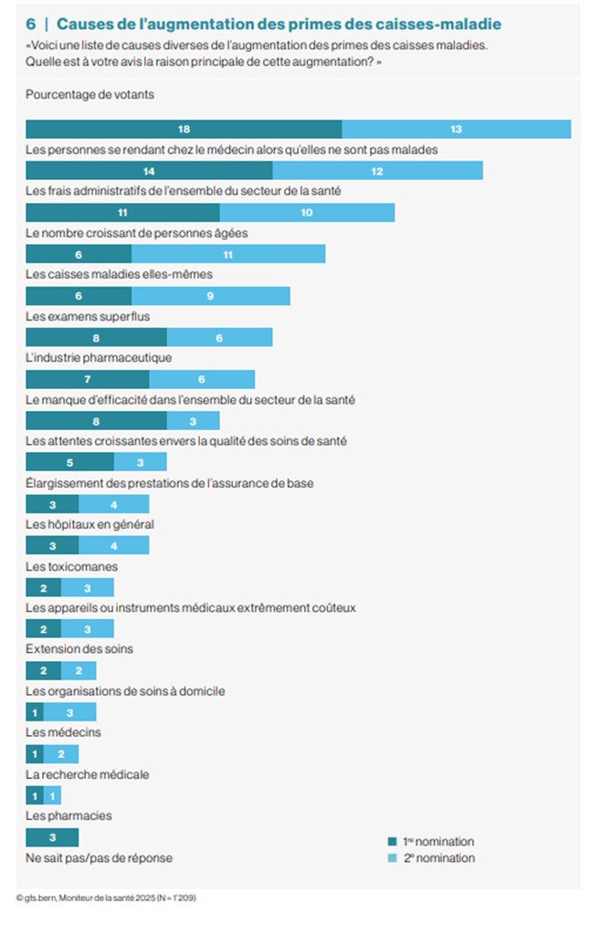 Les réponses à ce sujet sont très variées, mais il y a une focalisation nette sur les personnes qui se rendent chez le médecin alors qu’elles ne sont pas malades (31%), suivies des frais administratifs de l’ensemble du secteur de la santé (26%). D’autres causes fréquemment nommées sont le nombre croissant de personnes âgées (21%), les caisses-maladie elles-mêmes (17%), les examens superflus (15%) et l’industrie pharmaceutique (14%). La population perçoit aussi des faiblesses structurelles comme le manque d’efficacité (13%) et les attentes croissantes envers la qualité des soins (11%) comme des moteurs de cherté pertinents.