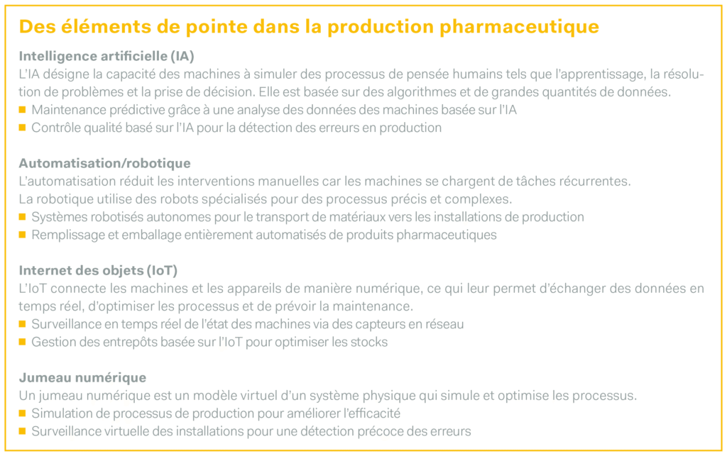 La profonde mutation de la production pharmaceutique suisse doit être maîtrisée principalement à l’aide des nouvelles technologies. En font notamment partie les éléments de pointe qui améliorent la fiabilité, la stabilité et l’efficacité des processus de fabrication et des chaînes d’approvisionnement, permettant ainsi aux patientes et aux patients d’accéder plus rapidement et en toute sécurité à des médicaments de qualité. Les processus hautement automatisés garantissent une précision maximale, tandis que l’intelligence artificielle (IA) analyse par exemple les couleurs ou les particules en temps réel. Les modèles de processus permettent à la fois la simulation et l’optimisation (jumeaux numériques ou «digital twins»), mais aussi le contrôle avancé des processus en temps réel. Ces avancées permettent un contrôle continu de la qualité, augmentent la vitesse de production et réduisent le risque d’erreurs humaines.