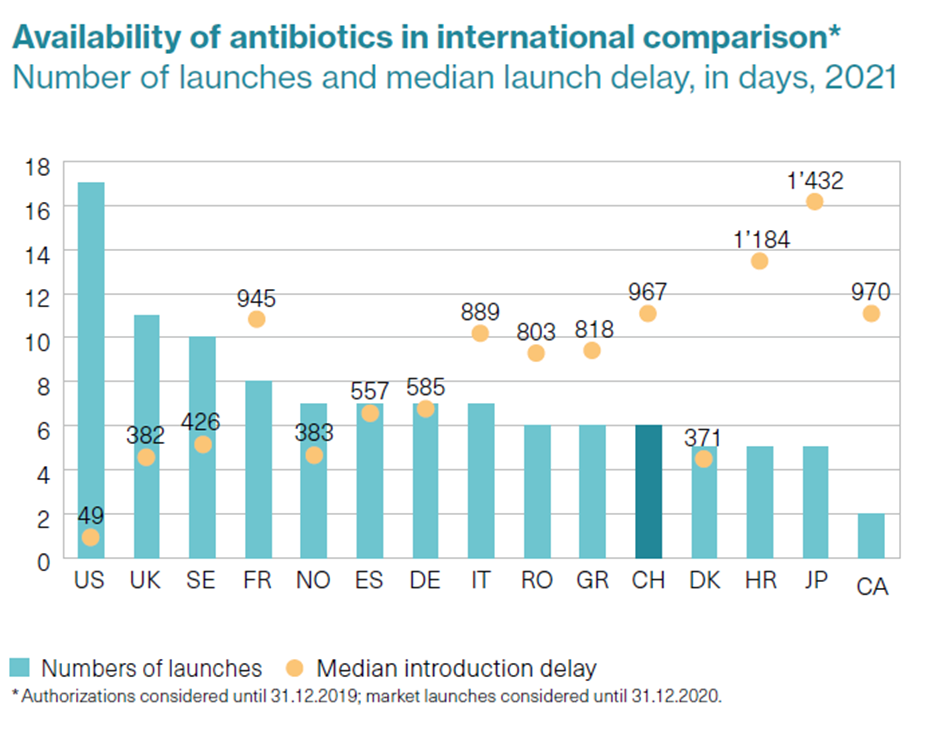 Patients in Switzerland wait significantly longer for new antibiotics to become available than in other countries. Of 18 antibacterial substances, by the end of 2019 only six had been approved in Switzerland. delay, These six substances made it onto the Swiss market on average 2.5 years after approval in the first country. Switzerland ranked eleventh out of the 15 countries listed in terms of the number of available antibiotics and in the “waiting time” ranking. So, there is still a lot to be done in this area: