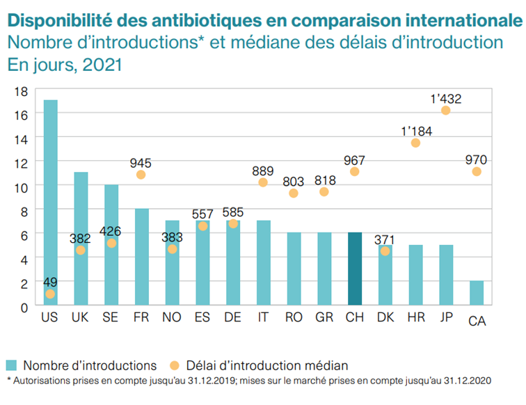 En Suisse, les patient-e-s attendent beaucoup plus longtemps les nouveaux antibiotiques que dans d’autres pays. Sur 18 substances antibactériennes, six seulement ont été autorisées en Suisse jusqu’à fin 2019 et ne sont arrivées sur le marché suisse qu’avec plus de 2.5 années de retard. Sur les 15 pays considérés, la Suisse se classe onzième pour ce qui est du nombre d’antibiotiques introduits. Le délai d’attente d’arrivée d’un antibiotique sur le marché est en Suisse de 967 jours, de sorte que notre pays atteint à cet égard également la onzième place. Il y a donc encore fort à faire:
