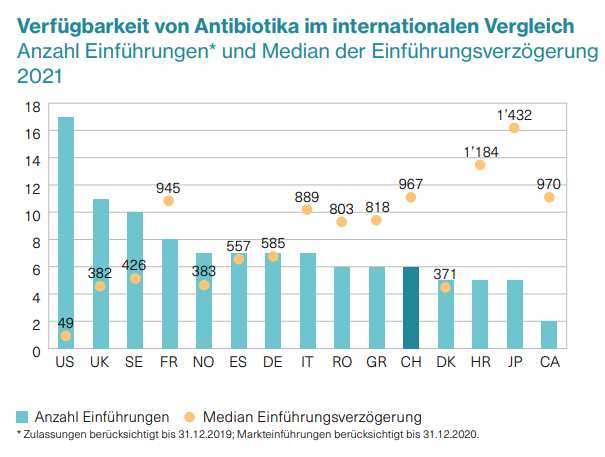 In der Schweiz warten Patientinnen und Patienten deutlich länger auf die Verfügbarkeit von neuen Antibiotika als in anderen Ländern. Von 18 antibakteriellen Substanzen wurden bis Ende 2019 in der Schweiz lediglich sechs zugelassen. Aufgrund der langen Wartezeit bis zur Zulassung schafften es diese sechs Substanzen im Schnitt erst 2.5 Jahre nach der Zulassung auf den Schweizer Markt. Die Schweiz belegt von den 15 aufgeführten Nationen den elften Platz, was die Anzahl eingeführter Antibiotika betrifft. Mit 967 Tagen, bis ein Antibiotikum auf dem Markt ist, landet die Schweiz bei der «Wartezeit» ebenfalls auf dem elften Platz. Hier gibt es also noch viel Handlungsbedarf: