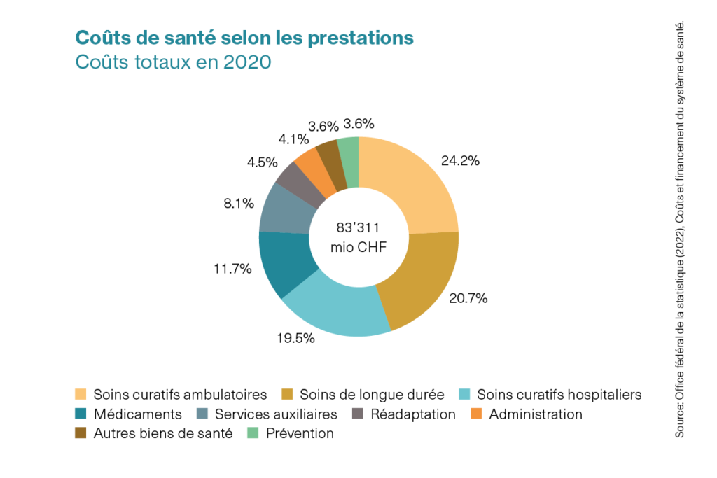 D’après les chiffres définitifs les plus récents de l’OFS, en 2020, les dépenses totales effectuées en Suisse pour le système de santé se sont montées à 83.3 milliards de francs, soit une croissance de +1% par rapport à 2019, inférieure à la tendance des années précédentes. La majeure partie des coûts, environ deux tiers, sont financés par les assurances sociales et les pouvoirs publics (Confédération, cantons, communes). Environ un cinquième sont directement à la charge des ménages privés. Près de deux tiers des coûts de santé, donc la plus grande partie, sont occasionnés par les traitements curatifs ambulatoires (24.2%), stationnaires (19.5%) et les soins de longue durée (20.7%). Les médicaments représentent quant à eux 11.7% de l’ensemble des dépenses de santé (9.7 milliards de francs).