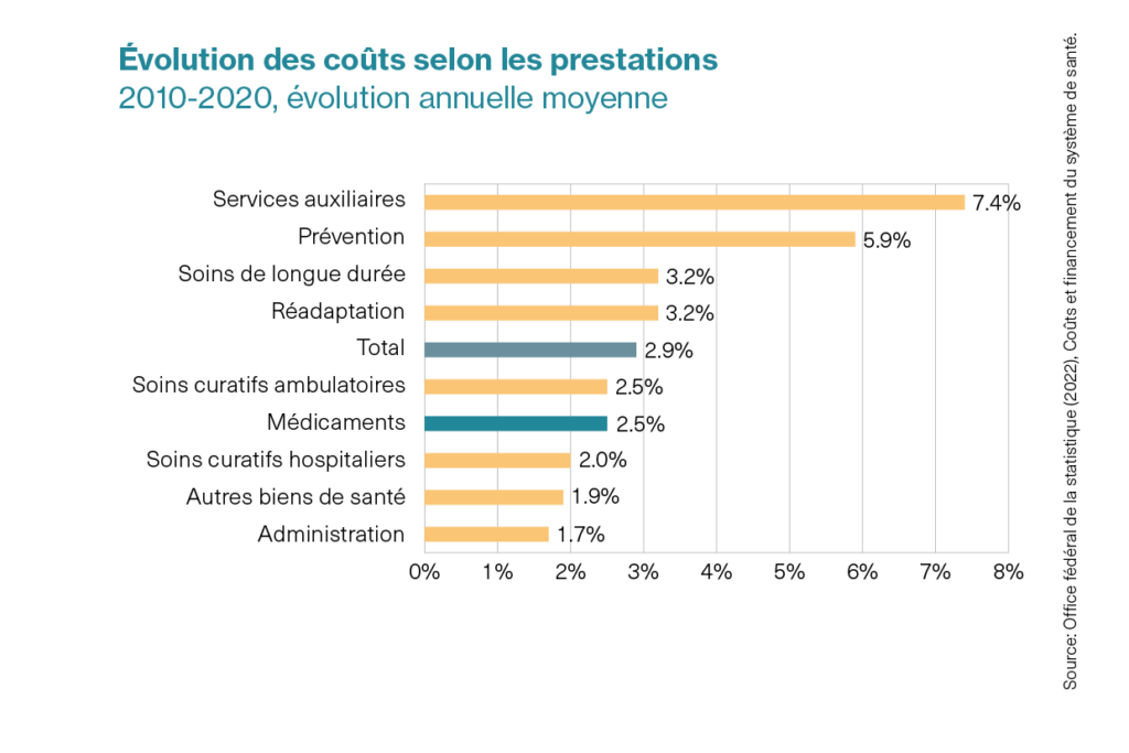 Le tableau est légèrement différent pour d’autres prestations du système de santé. Au cours des dix dernières années, les coûts de santé ont augmenté en moyenne de +2.9%. Les dépenses en médicaments ont augmenté de +2.5%, donc moins que les coûts de santé dans leur ensemble, ceci bien que de nombreux médicaments innovants soient arrivés sur le marché. Ce sont surtout des domaines comme la prévention et les services auxiliaires (p. ex. laboratoires, transports) qui enregistrent une forte hausse.