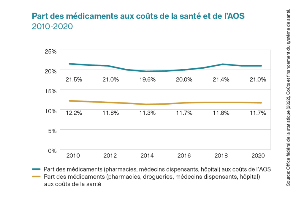 En 2020, leur part aux coûts de l’assurance obligatoire des soins (AOS) était de 21%. La part des médicaments aux coûts de l’AOS est plus élevée que leur part aux coûts globaux, car contrairement à d’autres groupes de prestations (par exemple aux traitements curatifs stationnaires), environ trois quarts des médicaments sont financés par le biais de l’assurance-maladie. Si on observe tout le «gâteau» (cf. graphique ci-dessus), on voit que la part des médicaments de 11.7% aux coûts de santé en 2020 n’était certes pas négligeable, mais pas non plus dominante. On peut donc dire que sur 100 francs dépensés dans le système de santé, un peu moins de 12 le sont pour des médicaments. L’évolution dans le temps montre en outre clairement que la part des médicaments aux coûts de santé est stable depuis de nombreuses années.
