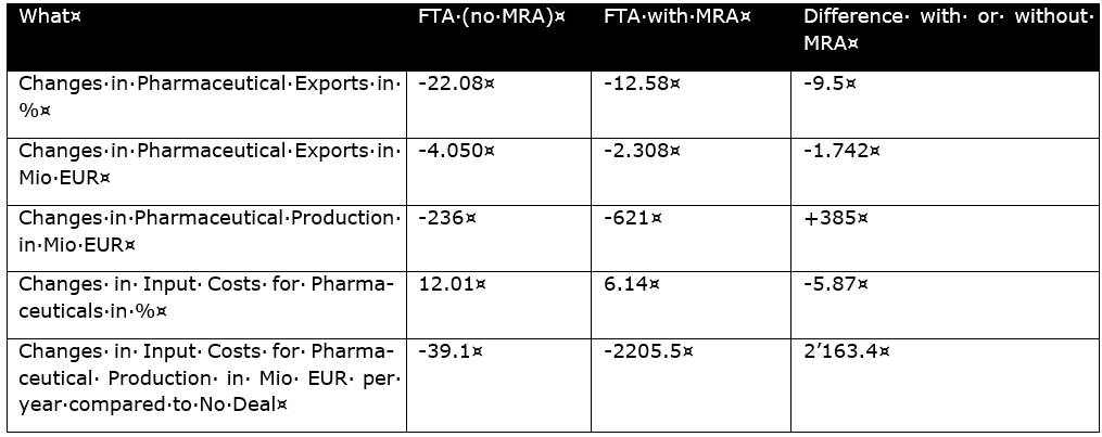 Grossbritannien und die EU haben kein solches MRA: Das TCA enthält kein EU-Recht. Folglich spielt auch der EuGH bei Schiedsverfahren keine Rolle. Folglich müssen britische Pharmafirmen sowohl die britischen als auch die EU-Normen einhalten, d.h. sie müssen mit Doppelzertifizierungen ihrer Chargen und zusätzlichen EU-Inspektionen ihrer Anlagen für den Export zurechtkommen. Mit diesem neuen Arrangement verlieren jedoch die britischen Unternehmen die gleichberechtigte Teilhabe am EU-Binnenmarkt. Sie haben damit erhebliche Wettbewerbsnachteile gegenüber ihren EU-Konkurrenten (und übrigens auch gegenüber der Schweizer Konkurrenz). Eine Studie des Institute for International and Development Economics schätzt, dass die britische Pharmaindustrie mit einem Rückgang ihrer Gesamtexporte um 10 Prozent konfrontiert sein wird, was fast 2 Milliarden Euro pro Jahr entspricht. Es ist jedoch zu beachten, dass der wirtschaftliche Nachteil einer Nichtteilnahme am EU-Binnenmarkt im Laufe der Zeit zunehmen wird.