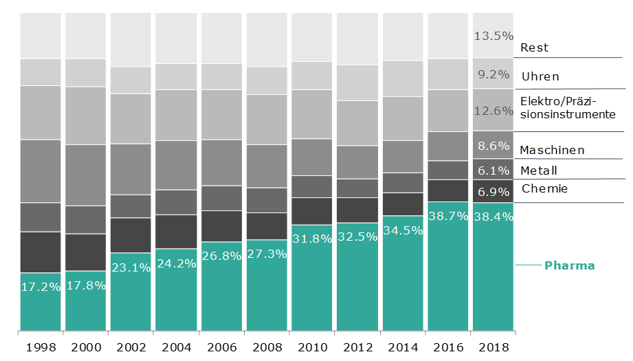 Insbesondere in konjunkturell schwierigen Zeiten zeigte sich immer wieder die Robustheit der Pharmaindustrie, die sich aufgrund des stark strukturell bedingten Potenzialwachstums deutlich weniger zyklisch verhält als der restliche Industriesektor. So stieg der Pharmaanteil mit den beiden Finanzkrisen zu Beginn und zum Ende des vorigen Jahrzehnts sowie mit dem Frankenschock 2015 deutlich an.