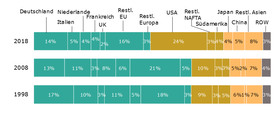 Im Zehnjahresvergleich (2008-2018) stieg vor allem der Anteil Nordamerikas