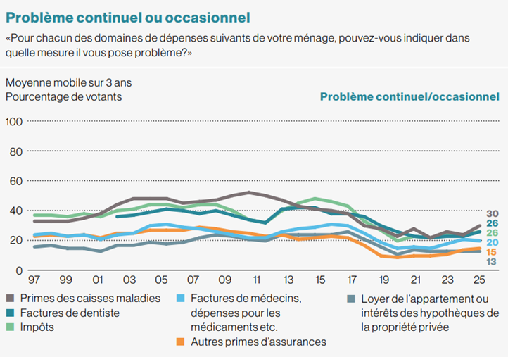 L’observation à long terme montre que la charge des coûts ressentie est inférieure à la moyenne en Suisse alémanique et italophone, avec une légère augmentation en Suisse alémanique par rapport à l’année précédente. Le problème ressenti augmente le plus fortement au niveau des coûts des factures de dentiste (18%, +6 points), des primes des caisses-maladie (17%, + 7points) et des impôts (15%, +5 points). En Suisse romande, les problèmes financiers perçus sont nettement plus marqués que dans les autres régions linguistiques, et ce dans toutes les catégories de dépenses.